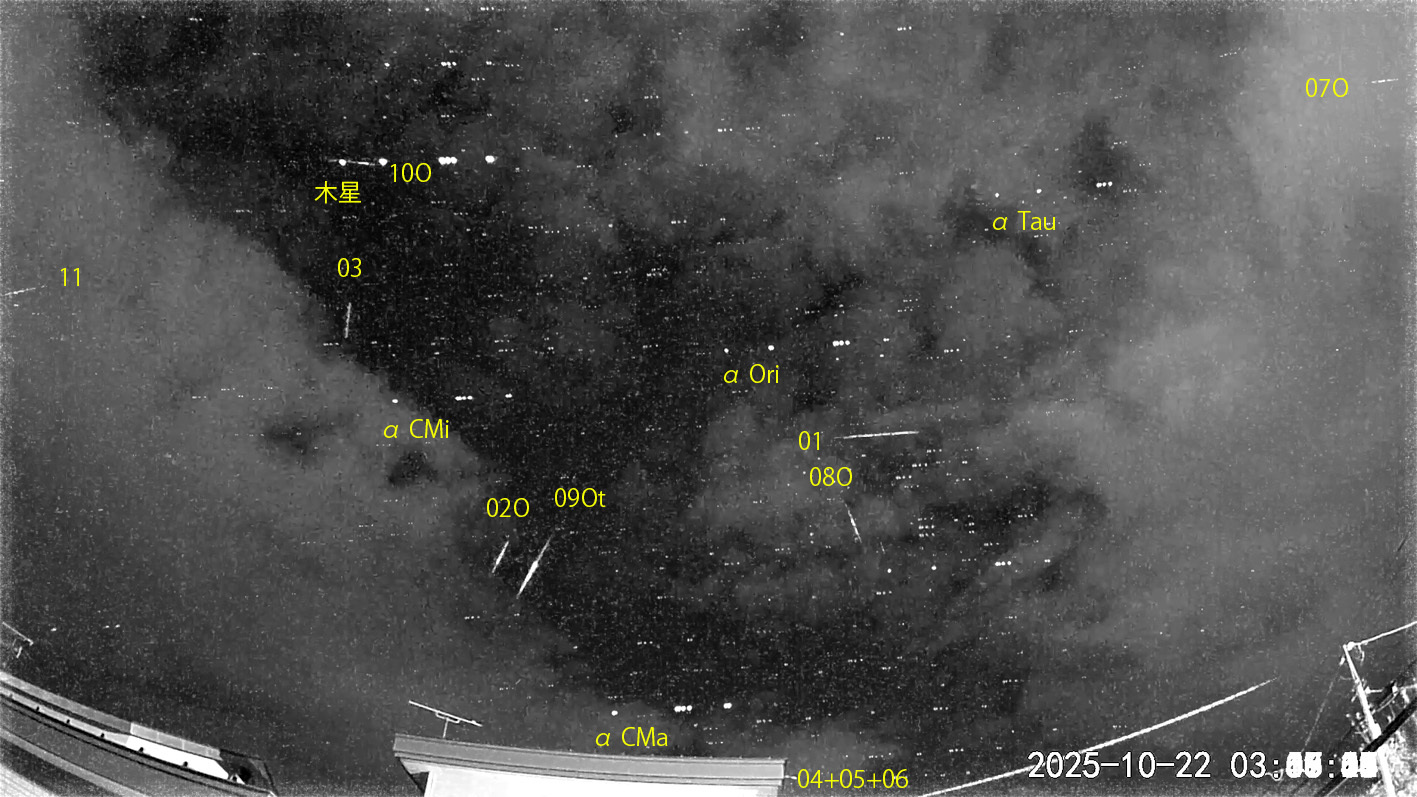 03:05から約1時間の11コマを処理しました。この時間帯だけが晴れたようです。 出現した順に数字と記号を始点付近に記入。tは痕traceあり。O:オリオン座流星群、ST:おうし座南流星群