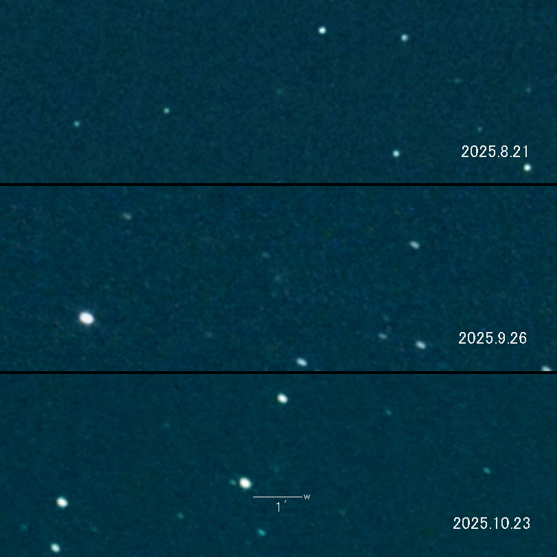 2025.8.21 → 17等級前半 2025.9.26 → 16等級前半 2025.10.23 → 17等級前半 2025年4月3日が近日点でした。 地球との位置関係で2025年9月頃が明るさのピークでした。