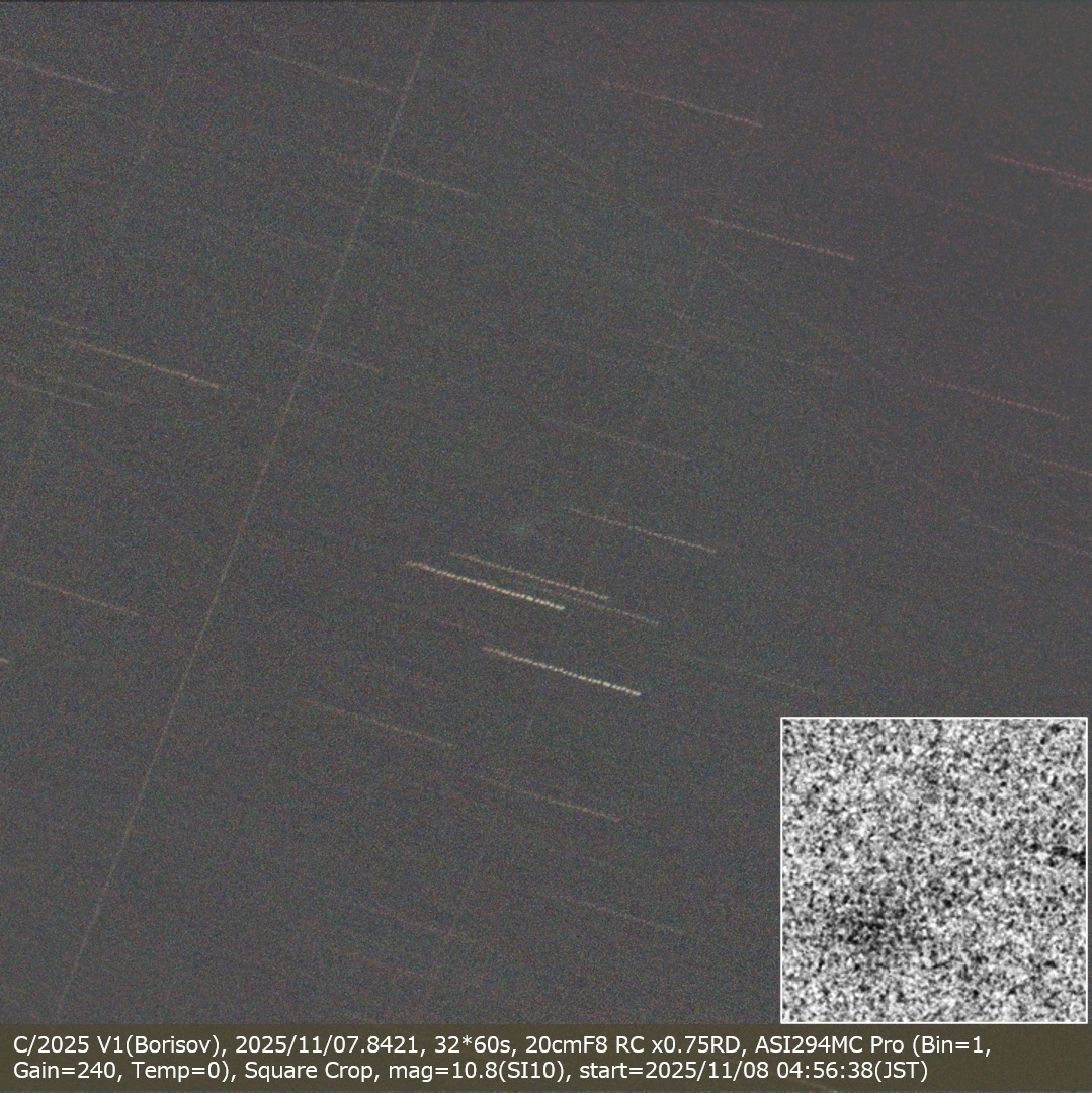 C/2025 V1(Borisov), 2025/11/07.8421, 32*60s, 20cmF8 RC x0.75RD, ASI294MC Pro (Bin=1, Gain=240, Temp=0), Square Crop, mag=10.8(SI10) 非常に淡い拡散像でした