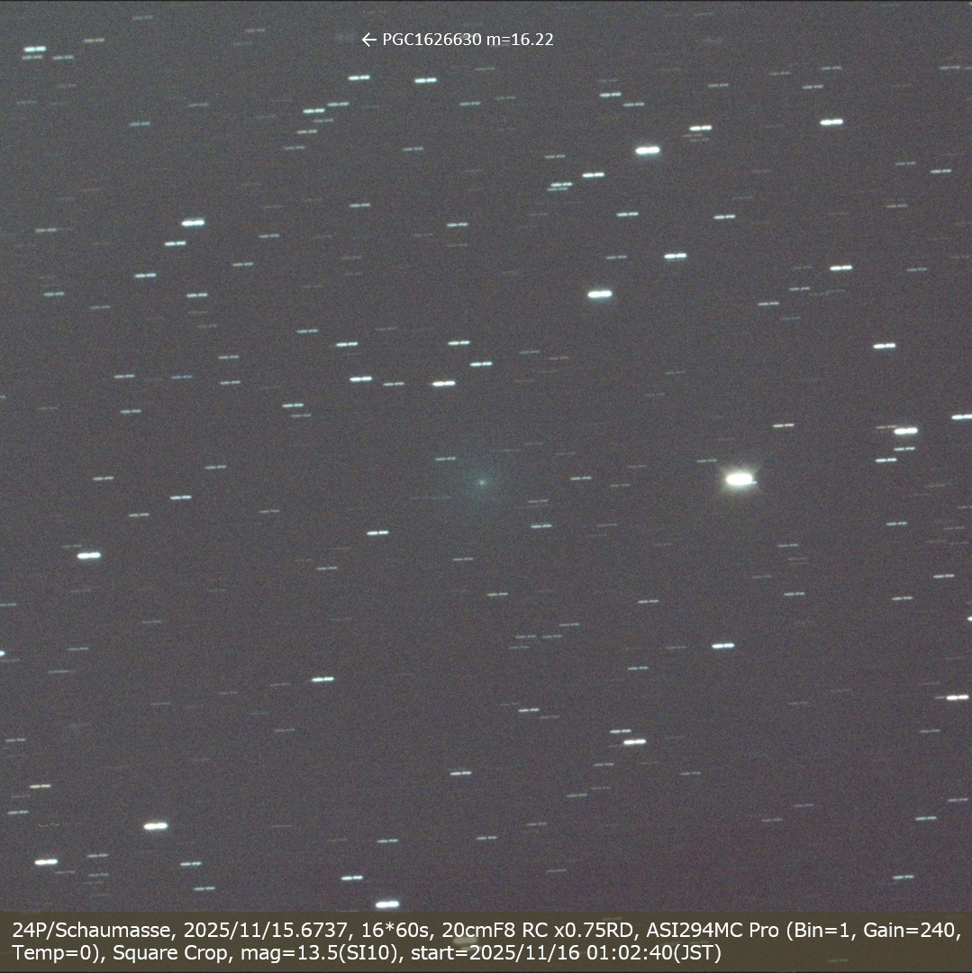 24P/Schaumasse, 2025/11/15.6737, 16*60s, 20cmF8 RC x0.75RD, ASI294MC Pro (Bin=1, Gain=240, Temp=0), Square Crop, mag=13.5(SI10) 御立岬と鞠智城で撮影した彗星のスライドショーなどの動画です https://www.youtube.com/watch?v=RTRZTIwH5k8