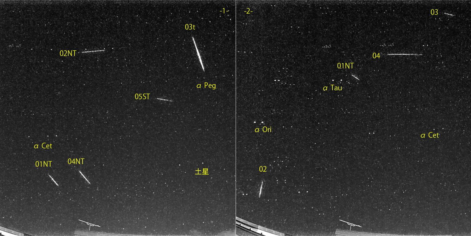1) 19:27から約3時間の5コマを、2) 21:40から約2.5時間の4コマを処理しました。19時台後半から晴れてきました。 出現した順に数字と記号を始点付近に記入。tは痕traceあり。ST:おうし座南流星群、NT:おうし座北流星群、L:しし座流星群