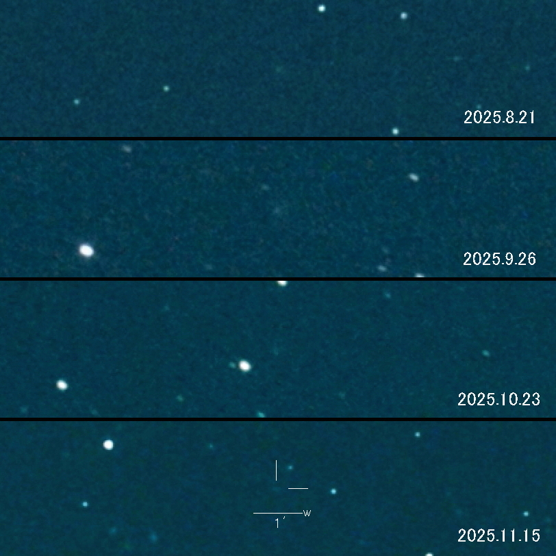 2025.8.21 → 17等級前半 2025.9.26 → 16等級前半 2025.10.23 → 17等級前半 2025.11.15 → 17等級後半 減光中です。 2025年4月3日が近日点でしたが 地球との位置関係により2025年9月頃が明るさのピークでした。