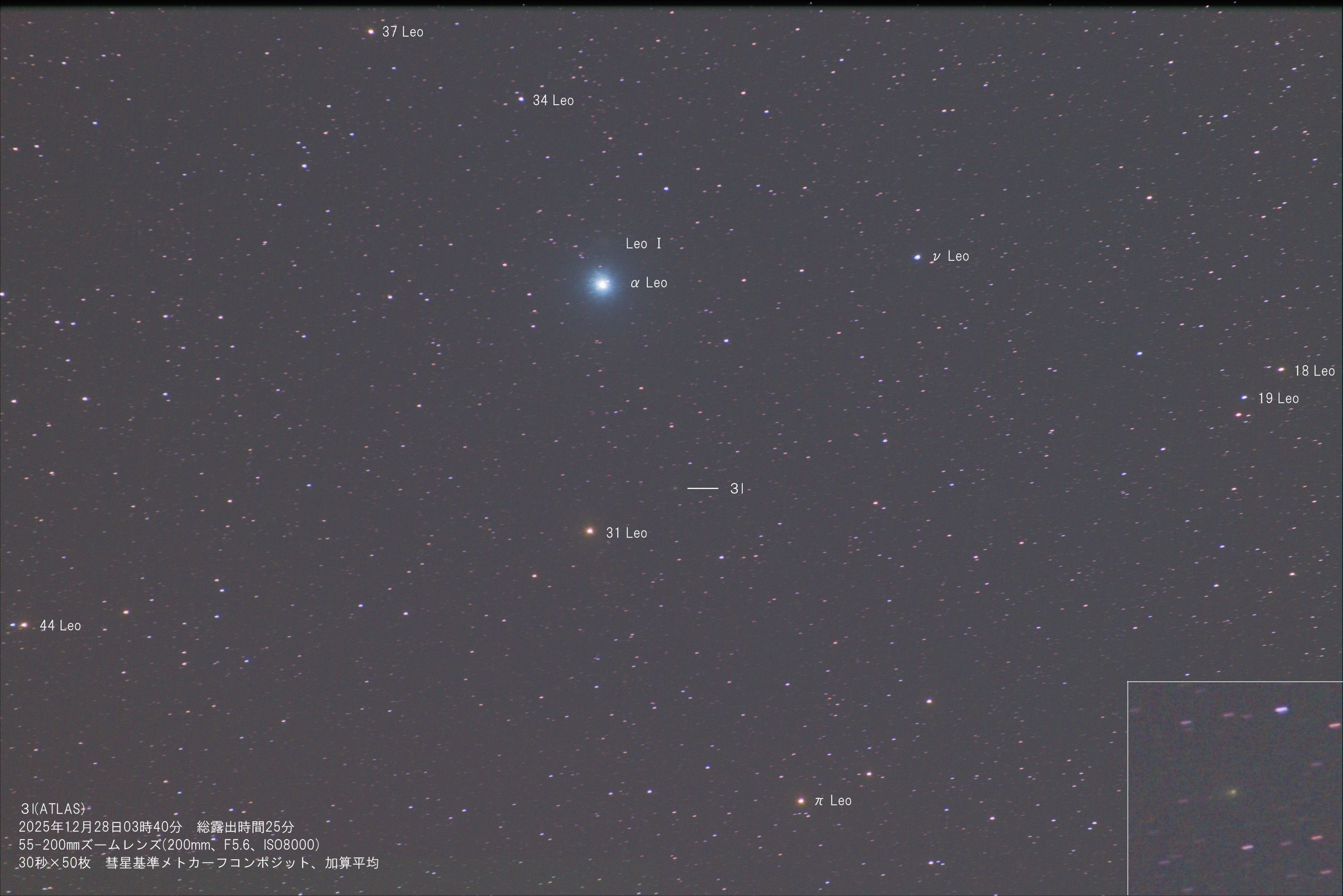 12月8日の3I(ATLAS)です。 しし座のレグルスのそばを通過中ということで撮影しました。 だいぶ暗くなりましたが、まだはっきりとした彗星像を呈しています。 200mmでも左側に少しアンチテイルがわかります。 眼視観測で12.4等級、1分と目測しました。