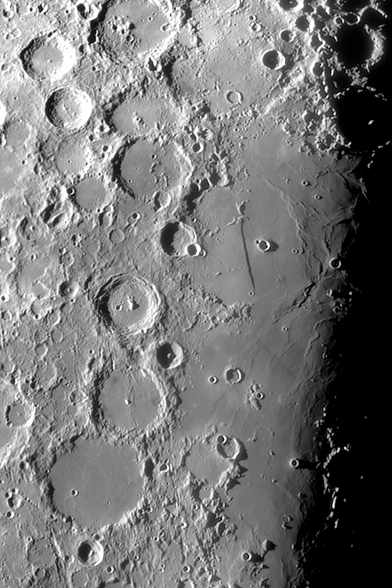 気流条件が良いうえ、月面の欠け際には格好の被写体が多数。しかし、月はまもなく上階ベランダの庇に隠れる・・・で、拡大撮影は直線の壁に一本化。壁周辺のリンクルが神秘的です。