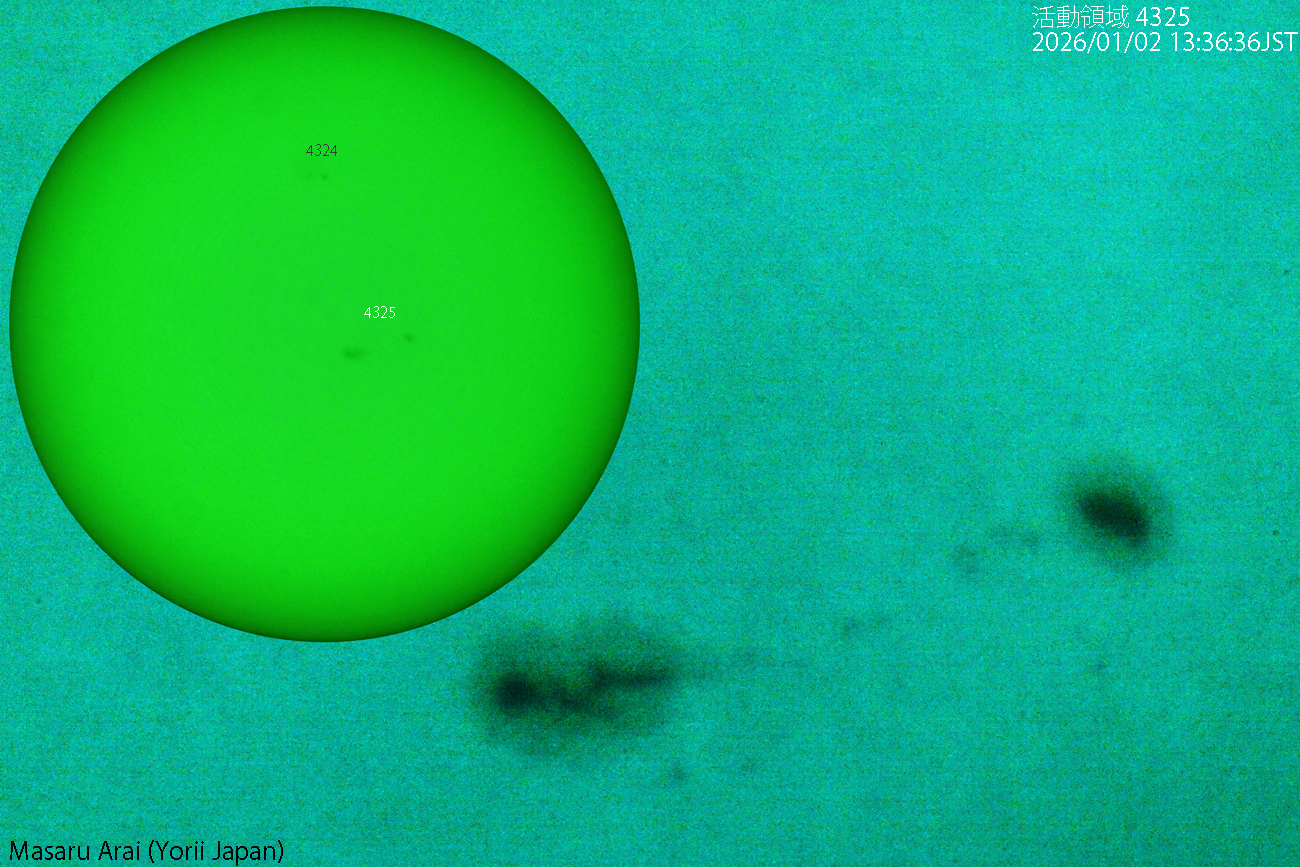 SE120L+DMC-GH1よる 4325( Eki/Eki ) です。 NICT情報:活動領域4324などでCクラスフレアが数回発生し、最大のものは、活動領域4325で1日11時25分JSTに発生したC9.6/SFフレアでした。