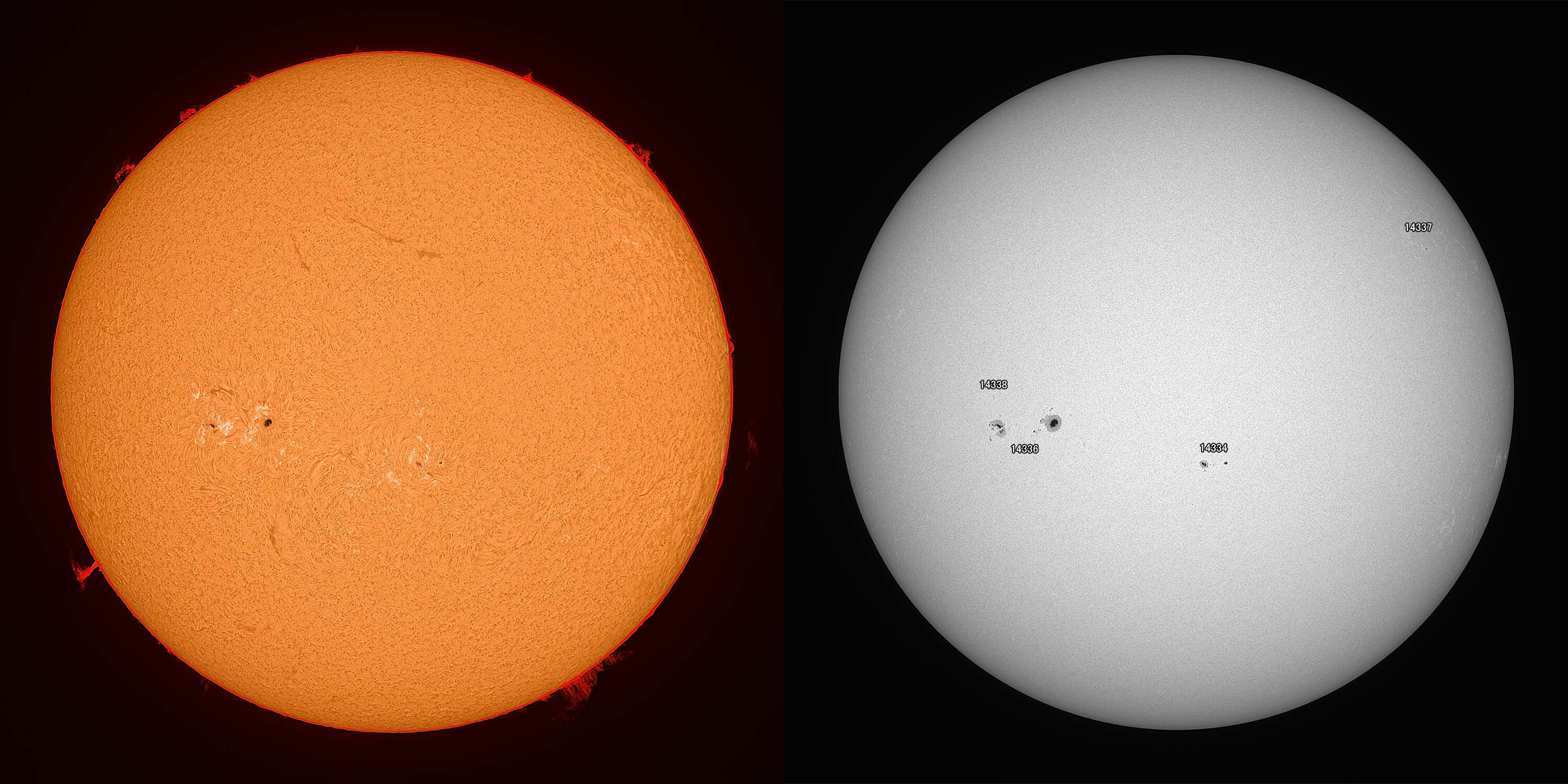 光球面:FireCapture、ROI 3600x2400、Gain 100、1.6msec x1000、撮影時間 31秒/プロミネンス:FireCapture、ROI 3600x2400、Gain 300、1.6msec x1000、撮影時間 31秒