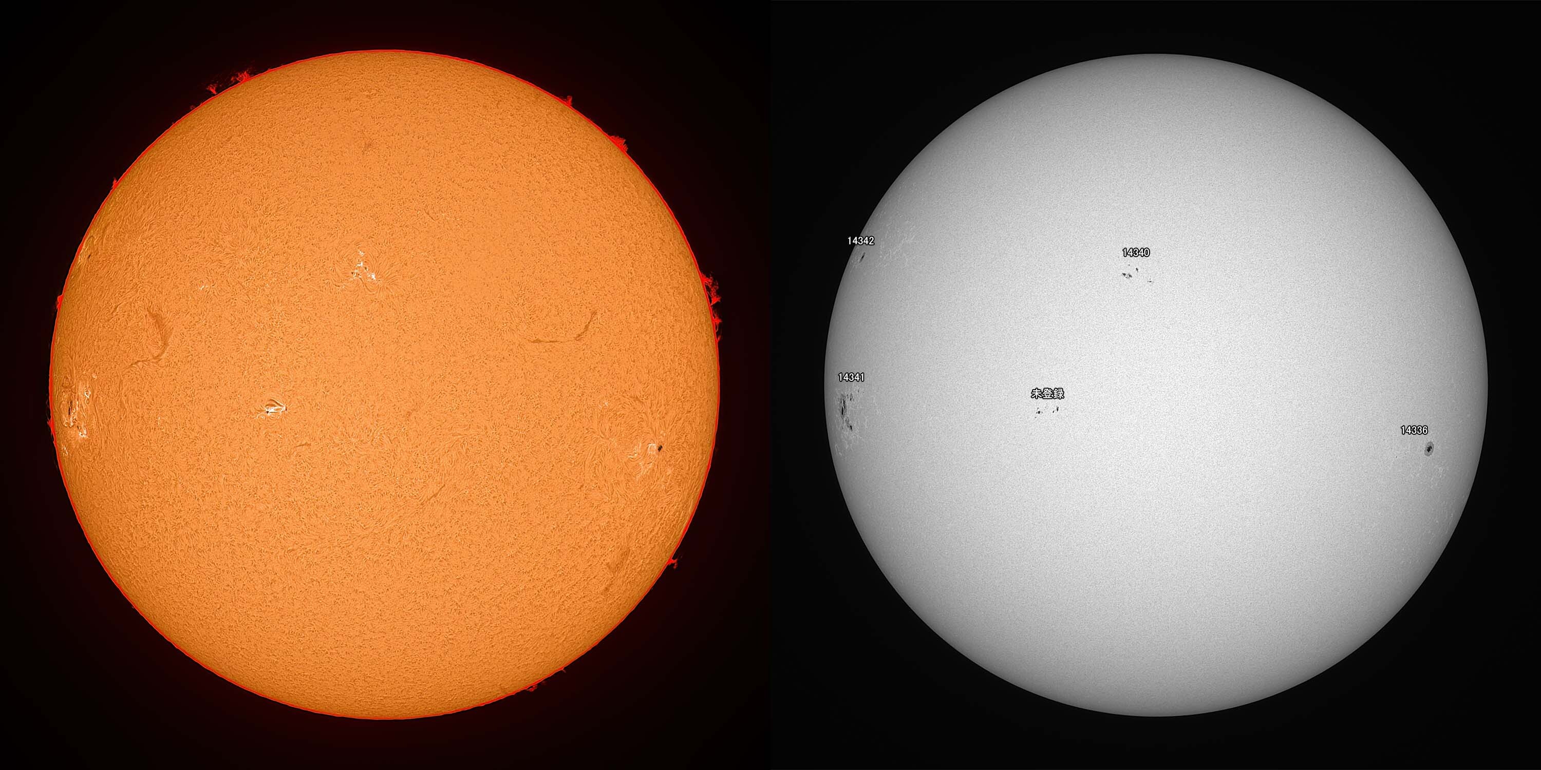 光球面:FireCapture、ROI 3600x2400、Gain 100、2.05msec x1000、撮影時間 31秒/プロミネンス:FireCapture、ROI 3600x2400、Gain 300、2.05msec x1000、撮影時間 31秒