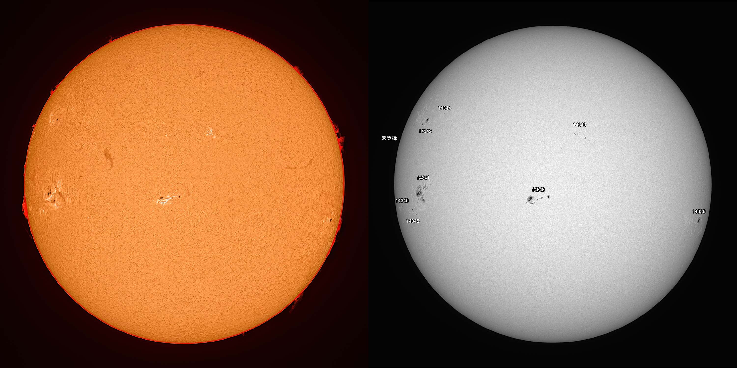 光球面:FireCapture、ROI 3600x2400、Gain 100、1.75msec x1000、撮影時間 31秒/プロミネンス:FireCapture、ROI 3600x2400、Gain 300、1.75msec x1000、撮影時間 31秒