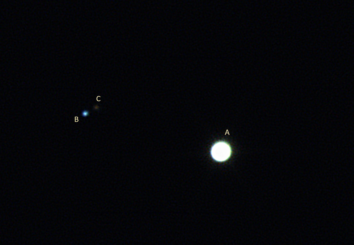 最も見やすい白色矮星と言われる、エリダヌス座ο2(40)星。主星Aはオレンジ色の4.4等、伴星Bが白色矮星で9.5等、伴星Cは赤色矮星で11等とのこと。Cは肉眼では見えなかったのですが、動画スタックで現れました。