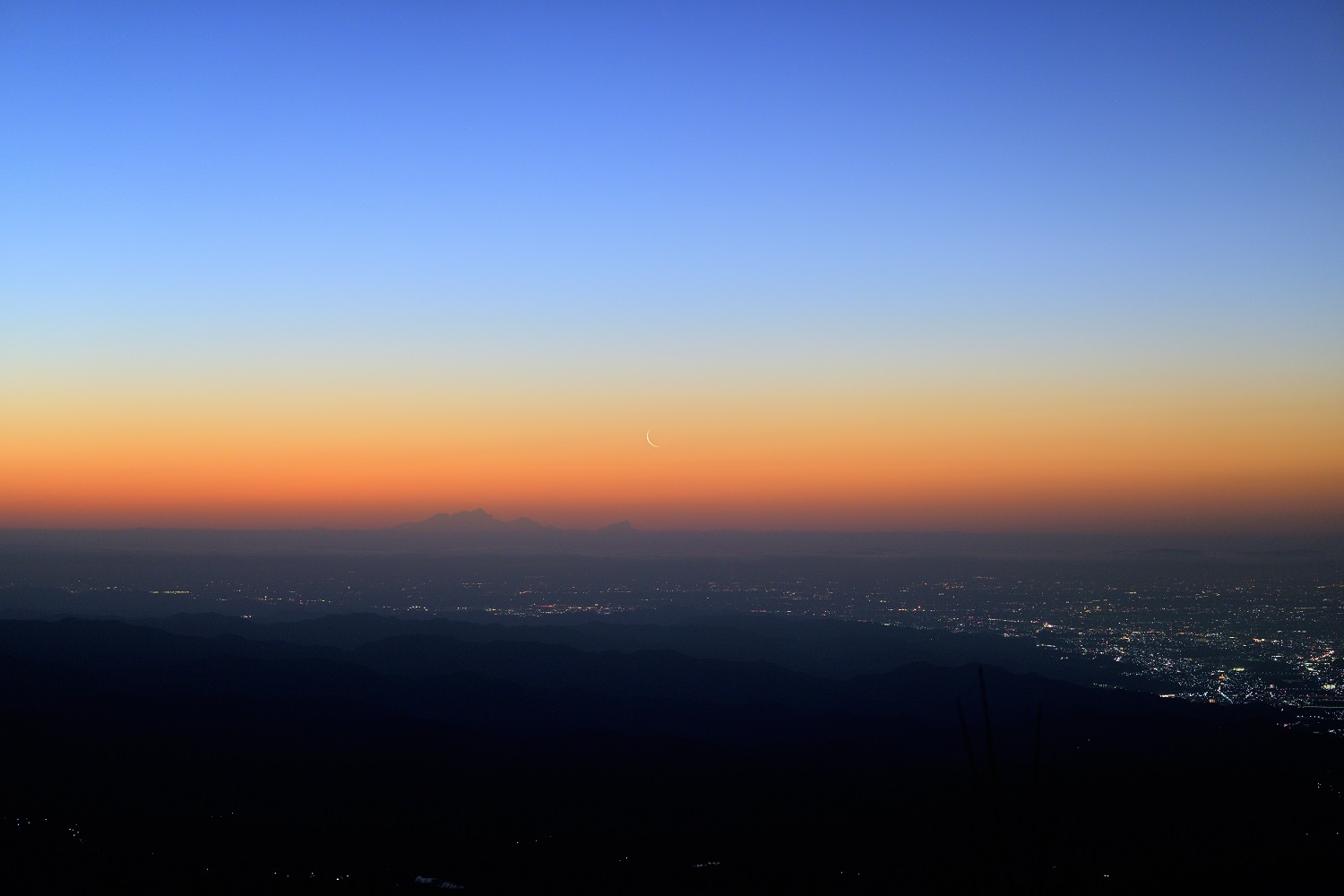1月17日早朝、赤城山鳥居峠から黄砂に霞む細い月(月齢27.8)を70mmで捉えた画像になります。 黄砂由来でマジックアワーのグラデーション彩度が低下しているのが残念・・・。