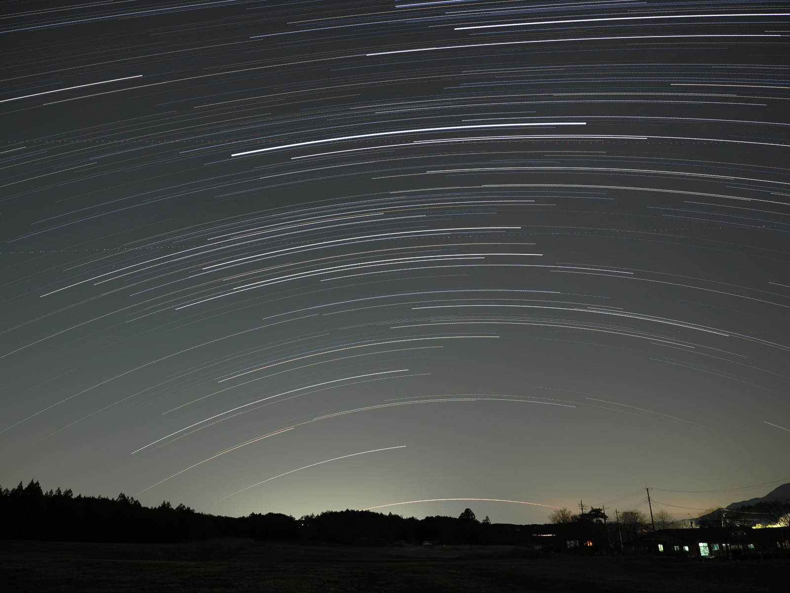 地表と夜空背景は、軌跡撮影終了後すぐに F2.8 ISO3200 16秒 で撮影した8コマを比較暗合成しています。