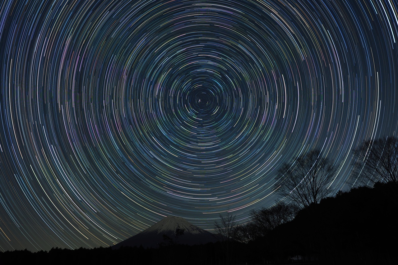 冷え込む標高約690mの富士市郊外にて黄砂が去った富士山と日周運動を撮ってみました。