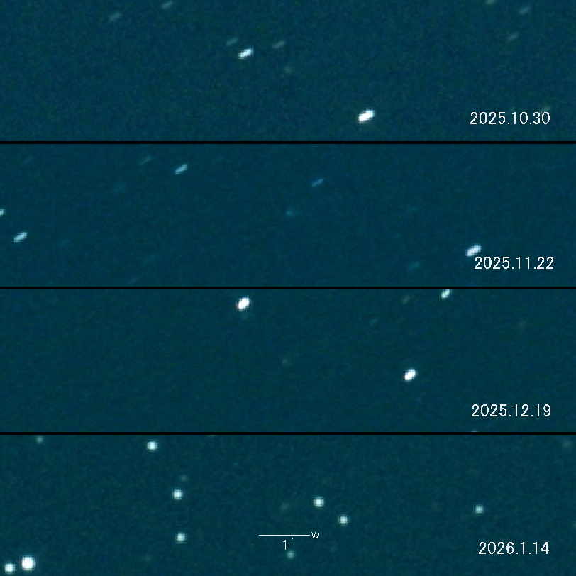 2025.10.30 → 16等級前半 2025.11.22 → 16等級前半 2025.12.19 → 16等級前半 2026.1.14 → 16等級前半 2025年8月5日が近日点でした。 地球との位置関係により2026年春が明るさのピーク という予想ですがずっと同じようなイメージです。