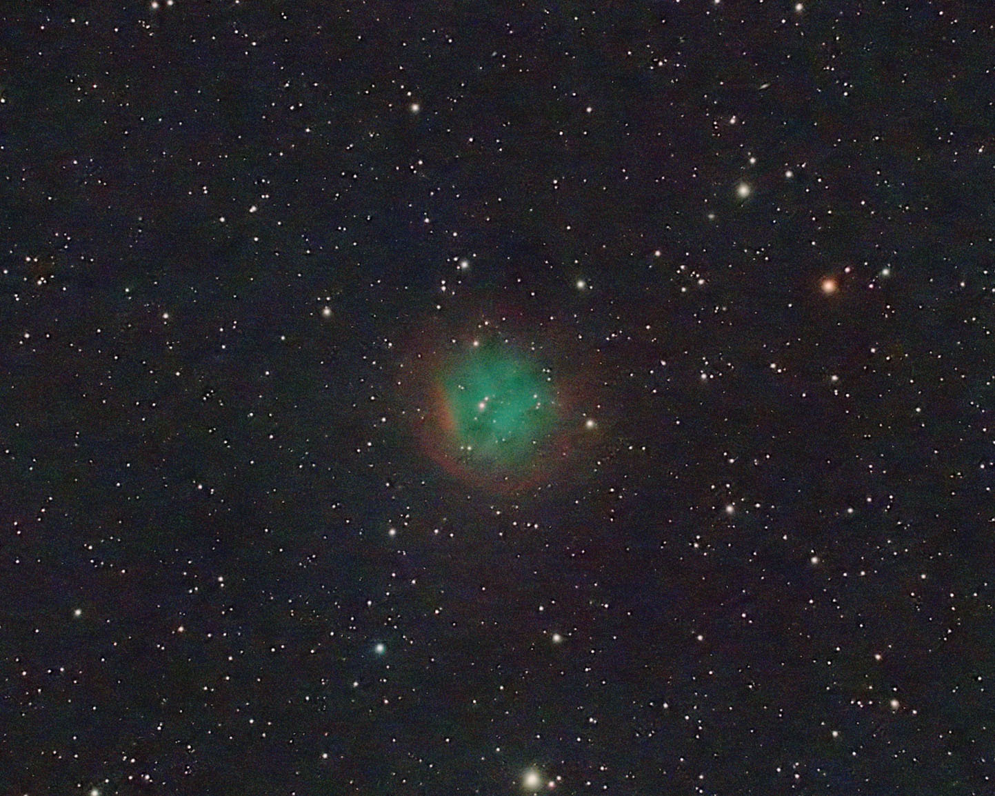 光害に悩む自宅から、自動導入を信頼して、古くて大きく拡散し淡い淡い惑星状星雲に二晩かけて挑戦してみました。オリジナル画像では全くわからず。撮影画像全部をコンポジットして、何か中央に映っている・・・という程度でした。かなり無理な処理をして、トリミングもしています。しかし自宅で撮れたということで満足です。