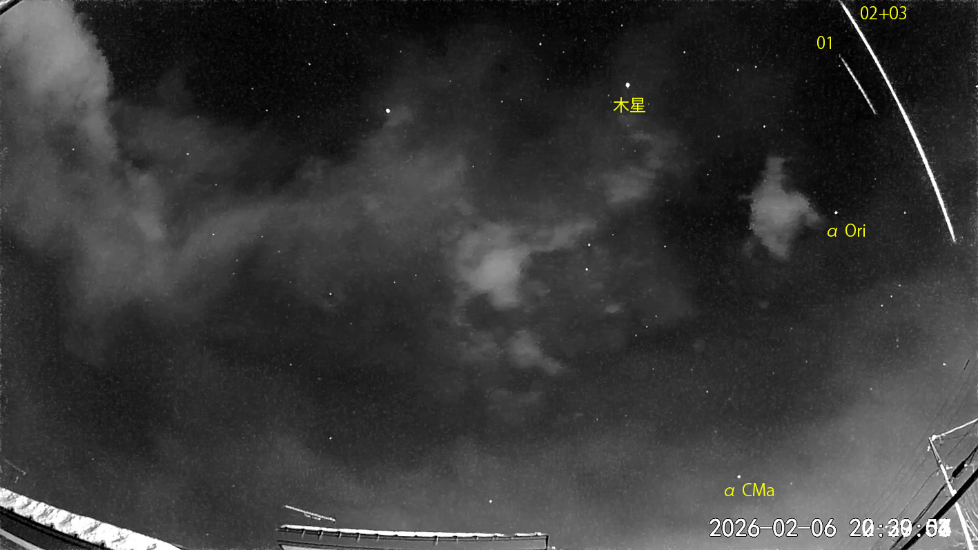 20:39から約0.5時間の3コマを処理しました。夜半前は雲の多い宵でした。 出現した順に数字と記号を始点付近に記入。tは痕traceあり。 今朝は15cmの降雪あり、雪片が風に乗って写り込むことがありました。