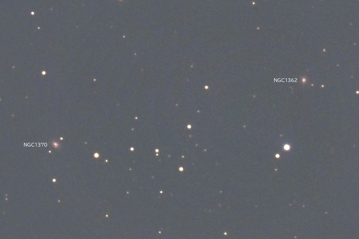 「エリダヌス座」にはτ星(タウ)がτ1~τ9まで9個ありますが、その中のτ5の北1.3度付近に位置する2態の銀河です。 明るさとタイプは、NGC1362が13.78等(B)_So、NGC1370が13.54等(B)_Eです。