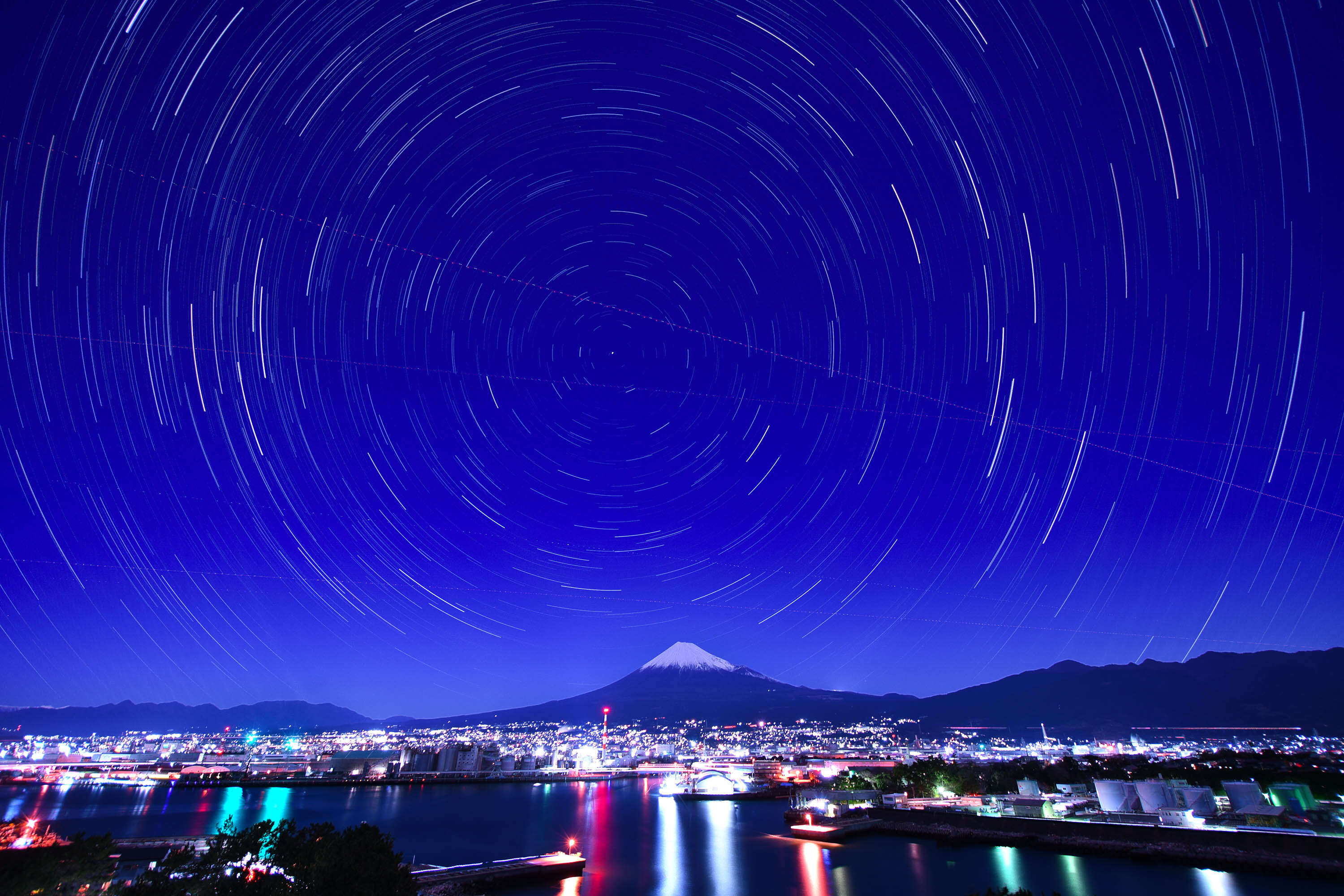 田子の浦から富士山と工場夜景と北天の日周運動 静岡県富士市