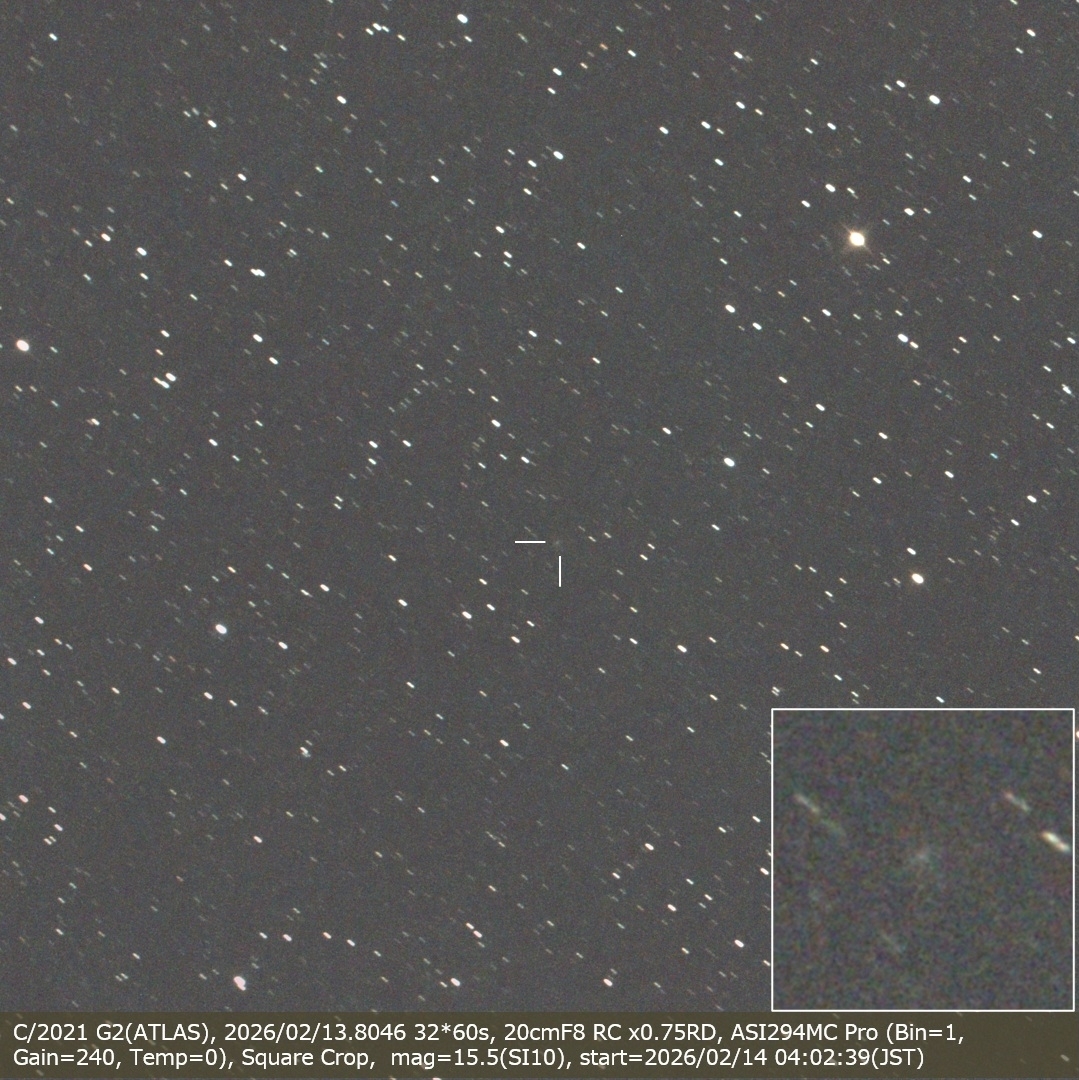 C/2021 G2(ATLAS), 2026/02/13.8046 32*60s, 20cmF8 RC x0.75RD, ASI294MC Pro (Bin=1, Gain=240, Temp=0), Square Crop, mag=15.5(SI10)