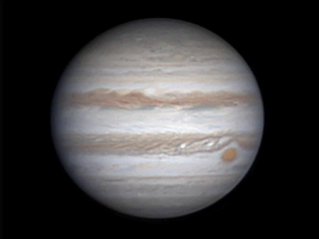 19時前に撮影を開始しましたが、酷いシーイングで1時間余りは画像にならず。 PCモニターを見続けて20時を過ぎたころから約1時間、上空の西風が強くなったり弱まったりを繰り返す冬特有の空になりました。 猛烈な西風が弱まると、それまで全く詳細のつかめなかった木星面のディテールが、湧きだすように見えてきました。 3分ほど風が弱まったのち、再び猛烈な風が吹きはじめ、ボケた2本の縞模様だけの木星に戻りました。 冬はもちろん、長時間安定した気流の日はほぼ皆無ですから、風の弱まった60秒間にcaptureした約5000コマの静止画像 の40%をstackし、Derotationなしの画像で仕上げています。