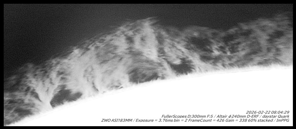 大きなプロミネンス群です。迫力はありますが動きが速くぼけてしまいます。