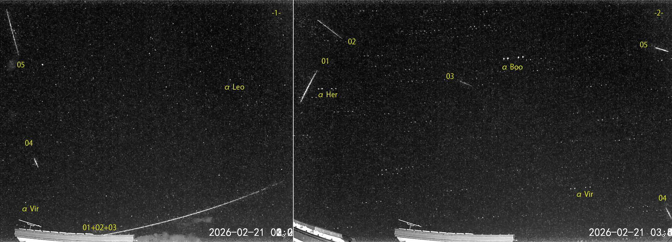 1) 00:08から約2時間の5コマを、2) 03:39から約1.5時間の5コマを処理しました。朝の最低気温マイナス7℃。 出現した順に数字と記号を始点付近に記入。tは痕traceあり。 うみへび座尾部付近から発する長経路流星が写りました。