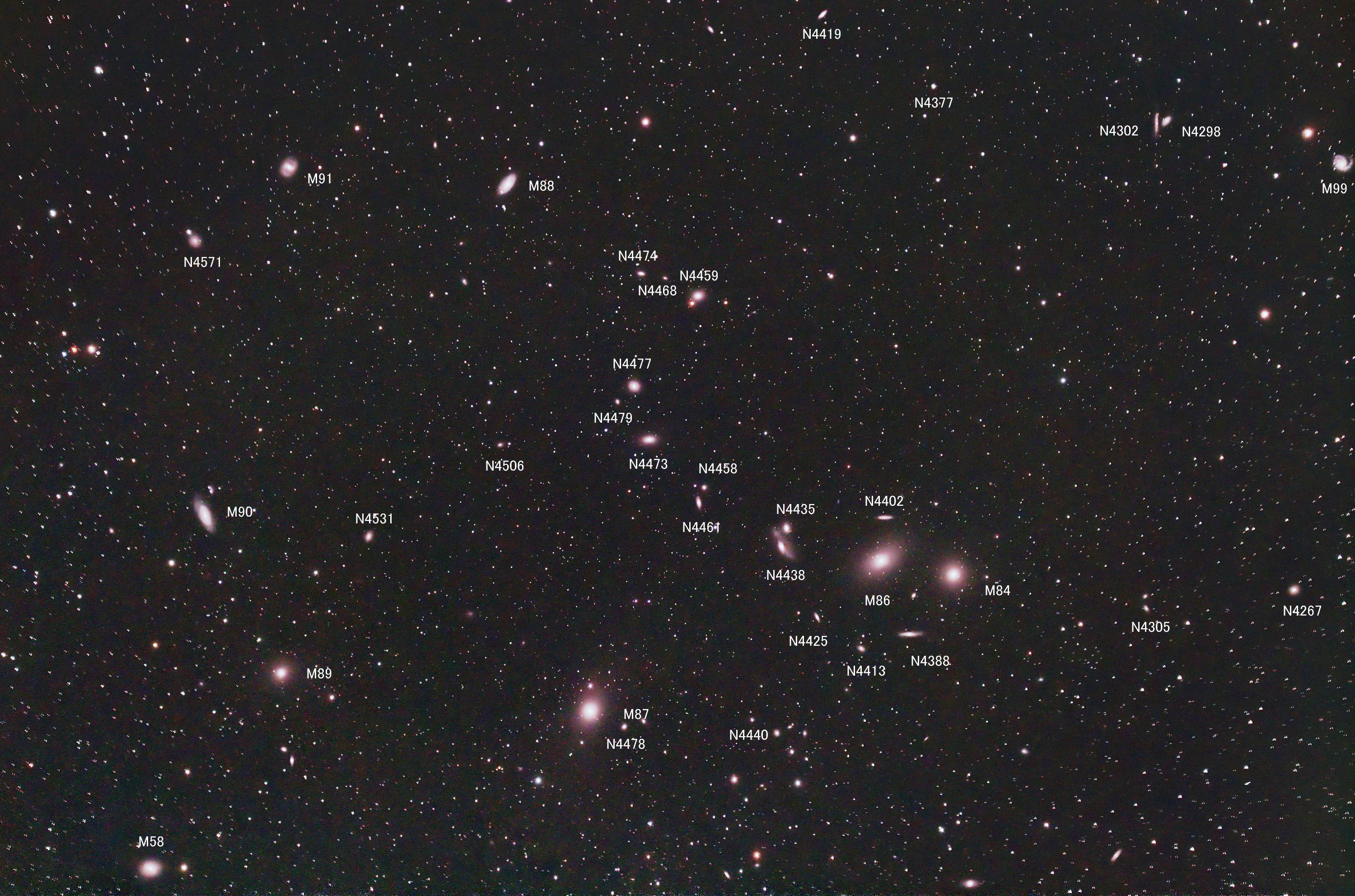 おとめ座銀河団を 250mmの 4時間露出で撮影したものを(#132946)にアップしましたが、そこにM天体番号9個とNGCカタログ番号24個を添えました。中央にマルカリアンチェーンがあります。重複になりますが番号があると便利です。