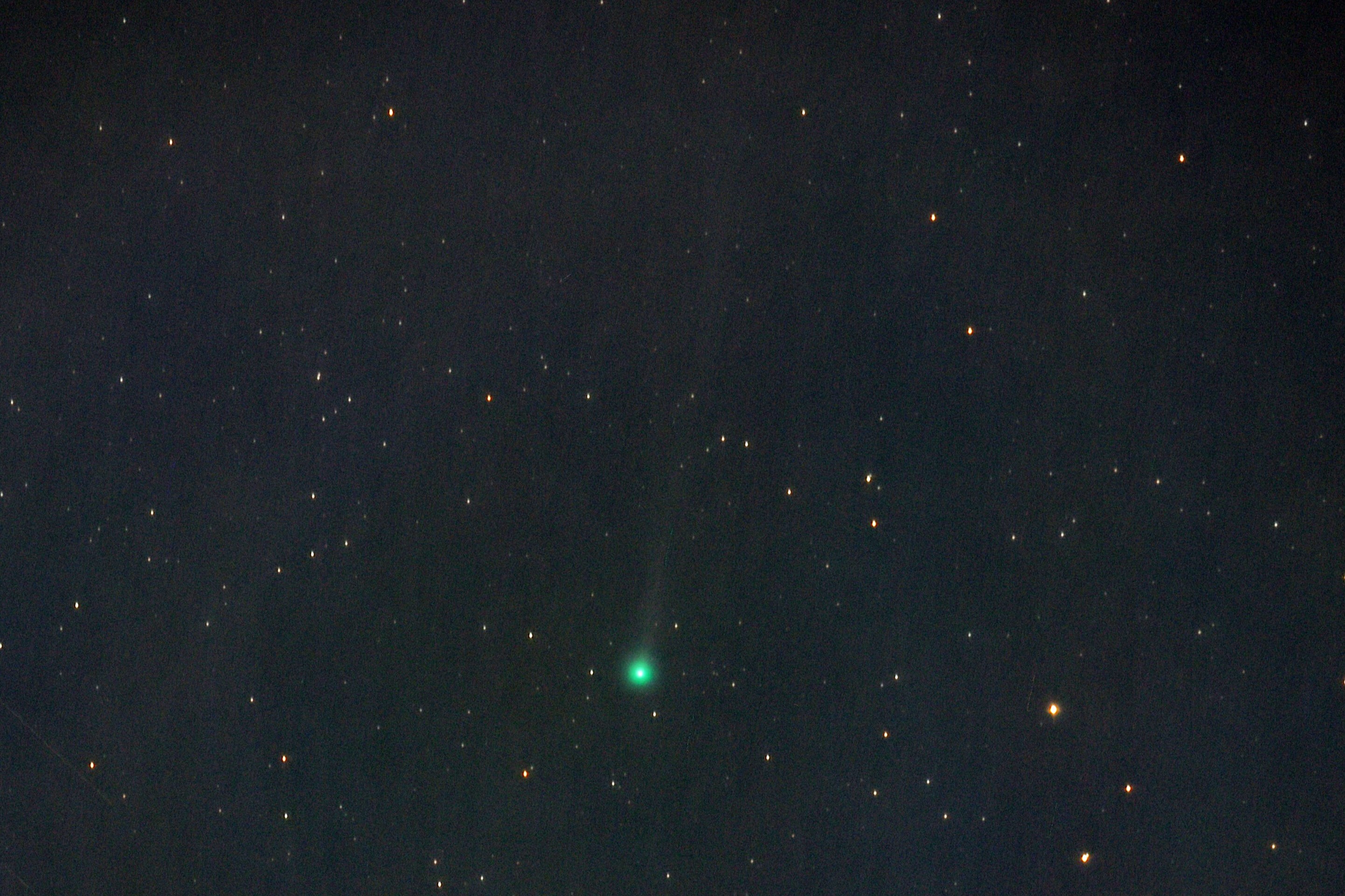 北極星が見えない部屋からの赤道儀簡易設置で出窓のガラス越しの部屋からの撮影なので星が流れています。満月の晩でしたが尾が写りました。