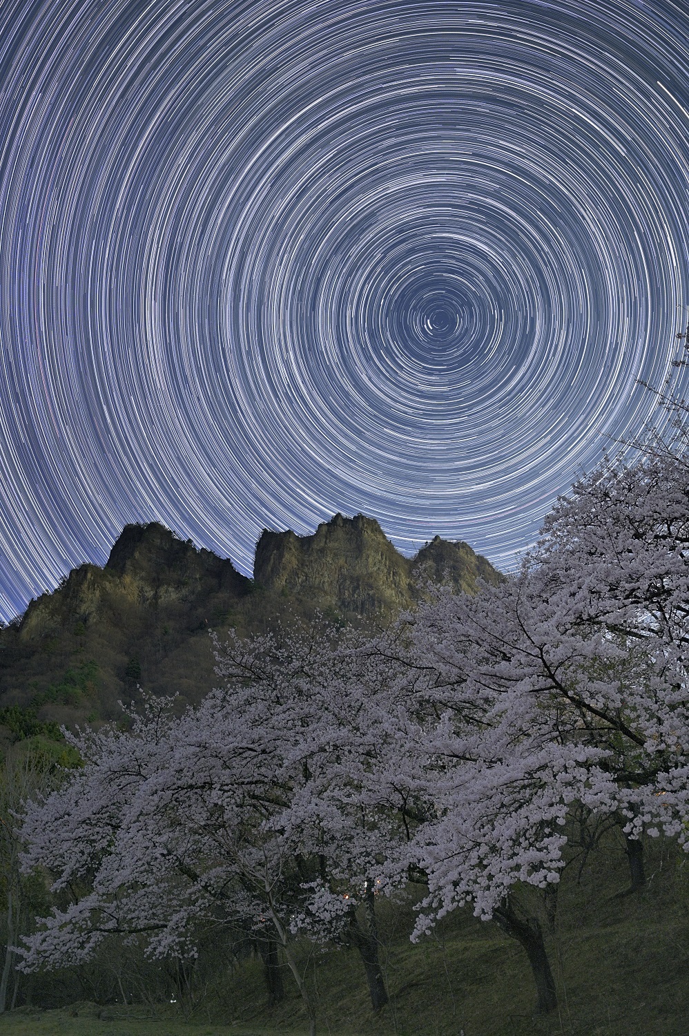 妙義山を背景にソメイヨシノと日周運動の共演を35mm、星の軌跡表現で捉えた画像になります。 ソメイヨシノが満開未満で物足りない感じになりましたが、撮影当日は快晴無風状態で積算露出3時間でソメイヨシノはブレが無く、メリハリある表現ができ心揺さぶる1枚に仕上がったように思います・・・。