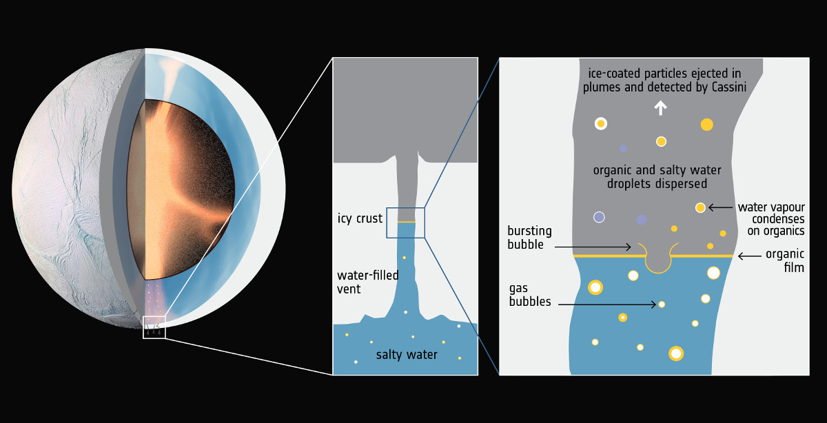 研究チームでは、これと同じプロセスがエンケラドスでも起こっているかもしれないと考えている。深海から気体の泡が数十kmにわたって上昇することで有機物を運び上げ、氷地殻の下にある海面に薄い膜を作るのだ。泡が海面ではじけると、有機物の膜の一部が飛び散って塩分に富んだ海水とともに拡散する。この水蒸気がエンケラドスの表面で凍ると、有機物の小さな滴も氷で覆われ、凍った海水のしぶきと一緒に水煙となって放出されて、これがカッシーニに検出された、というわけだ。