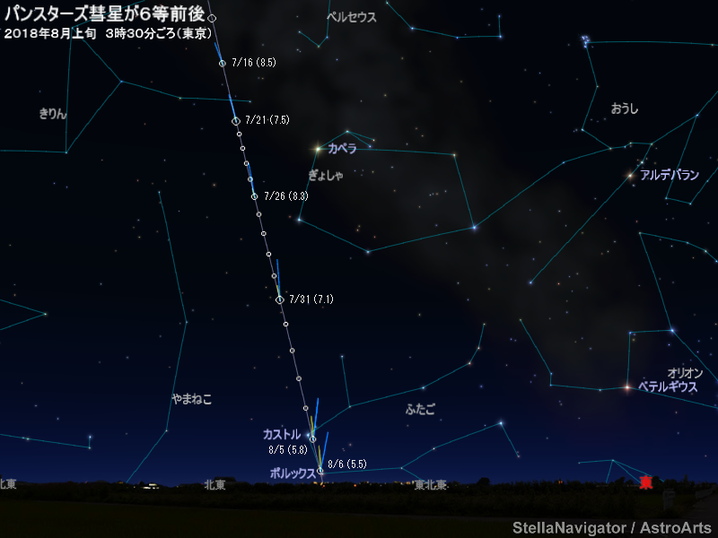 8月上旬ごろ、パンスターズ彗星(C/2017 S3)が6等前後まで明るくなる可能性があると予想されている。2017年9月に発見された彗星で観測数が少ないため、明るさの見積もりには不定性が大きい。