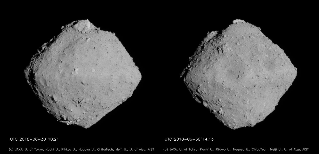 ホームポジションからONC-T(望遠の光学航法カメラ)で撮影されたリュウグウ。(左)6月30日19時21分(日本時間、以下同)ごろ撮影、(右)23時13分ごろ撮影。左右の画像でほぼ正反対の位置を撮影している。画像クリックで表示拡大(提供:JAXA、東京大、高知大、立教大、名古屋大、千葉工大、明治大、会津大、産総研)