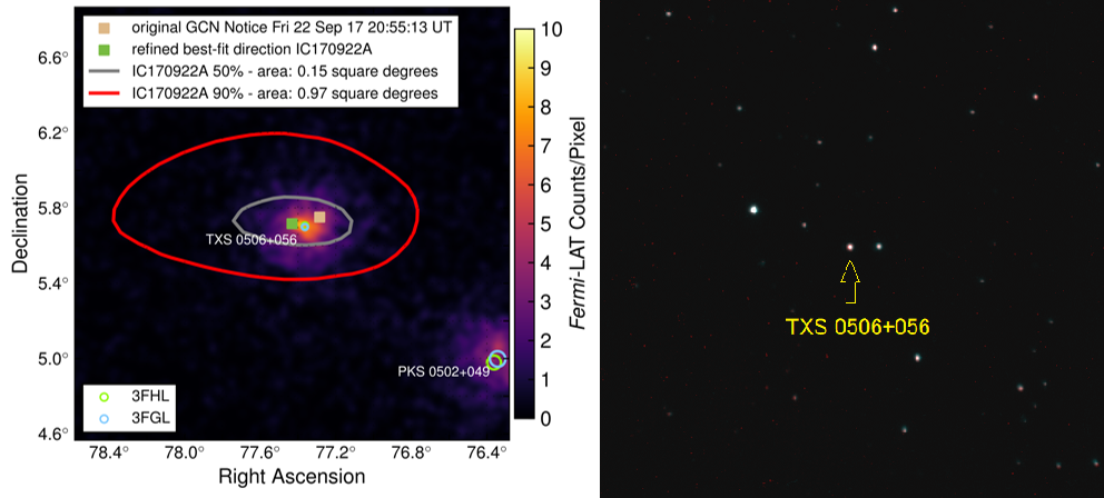ブレーザー「TXS 0506+056」とその周辺の画像。(左)「フェルミ」によるガンマ線強度マップ、(右)かなた望遠鏡のHONIRで取得された可視光線・近赤外線の合成擬似カラー画像。画像クリックで表示拡大(提供:広島大学リリースページより)