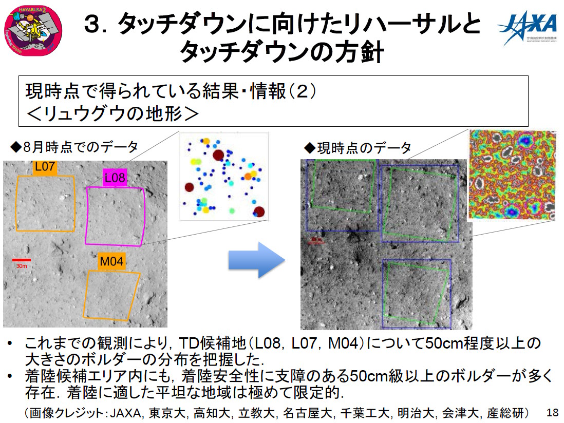 「はやぶさ2」はこれまでに6回の降下運用を行い、10月3日に行われた着陸機「MASCOT」の分離では高度51mまで降下した。こうした運用のたびに、着地候補地点の画像を低い高度から撮影し、着地に支障のある高さ50cm以上の岩塊の分布などを調べてきた。