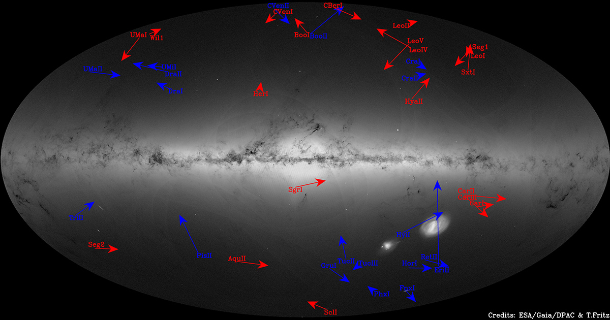 39個の矮小銀河の名称と移動の向き。青い矢印は天の川銀河の中心へ接近する動き、赤い矢印は中心から離れる動きを示す。画像クリックで表示拡大(提供:Gaia Data Processing and Analysis Consortium (DPAC); A. Moitinho / AF Silva / M. Barros / C. Barata, Universidad de Lisboa, Portugal; H. Savietto, Fork Investigación, Portugal & T.Fritz)