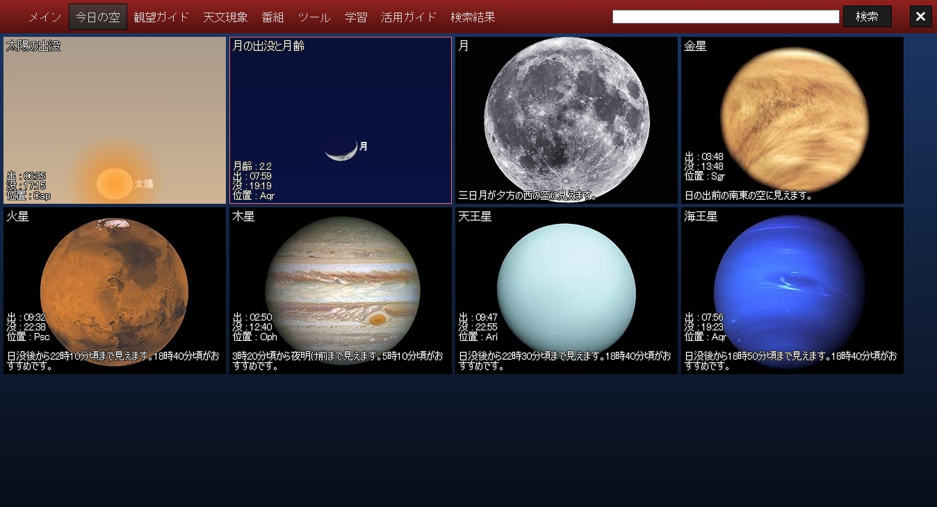 - 新しく搭載された「ステラパネル」では、ステラナビゲータに搭載されている豊富な機能を簡単に呼び出せます。当日のおすすめの天体や近日中の天文現象、プラネタリウム番組、コンテンツにも素早くアクセスできます。