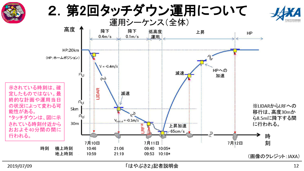 タッチダウン日時は明日11日の午前10時18分の予定(最速の場合)となっている。それまでの間に何度かのチェックポイントを経ながら降下を続け、高度30m以降は自律制御によってタッチダウンを行う。自律制御の際には、5月末の運用でC01-Cbの中心から2.6m離れたところに投下されたターゲットマーカーを目印とする。