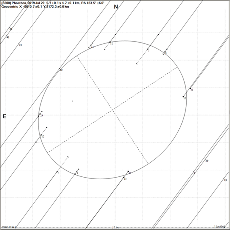 デビッド・ダナムさん(IOTA)たちが整約した観測成果により、ファエトンの形状について5.67km×4.72kmの楕円形の断面が浮かび上がってきた。この結果は、さらに今後の研究により改定される可能性がある。