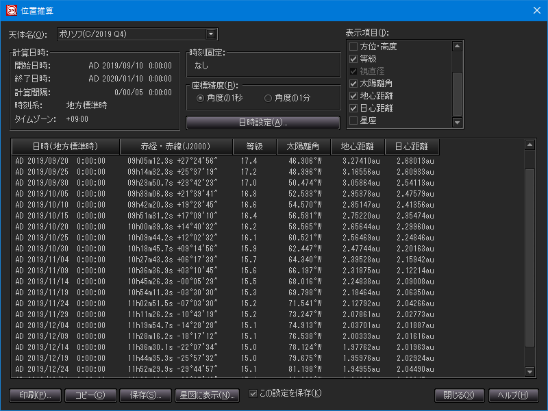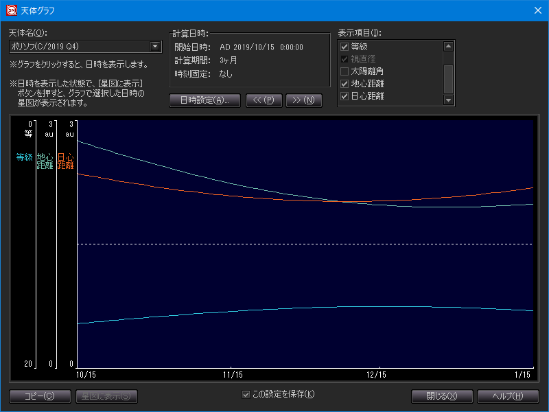 ステラナビゲータで出力した、ボリソフ彗星の位置推算表と天体グラフ。それぞれ画像クリックで表示拡大。現時点のデータに基づくと地球最接近は12月28日、太陽最接近(近日点通過)は12月8日(いずれも日本時)
