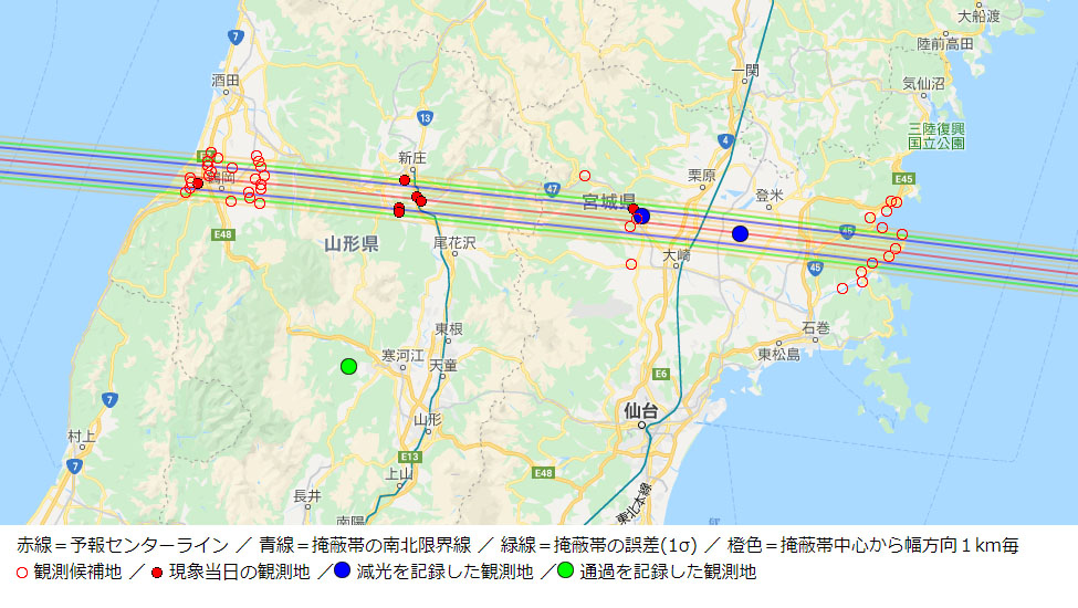天のいたずらか、現象当日は、またしても雲や霧の発生などで天候に悩まされた。このため今回も、直前の判断で観測地を移動した班もあったが、その努力が実り宮城県北部の2地点で食による減光の観測に成功した。