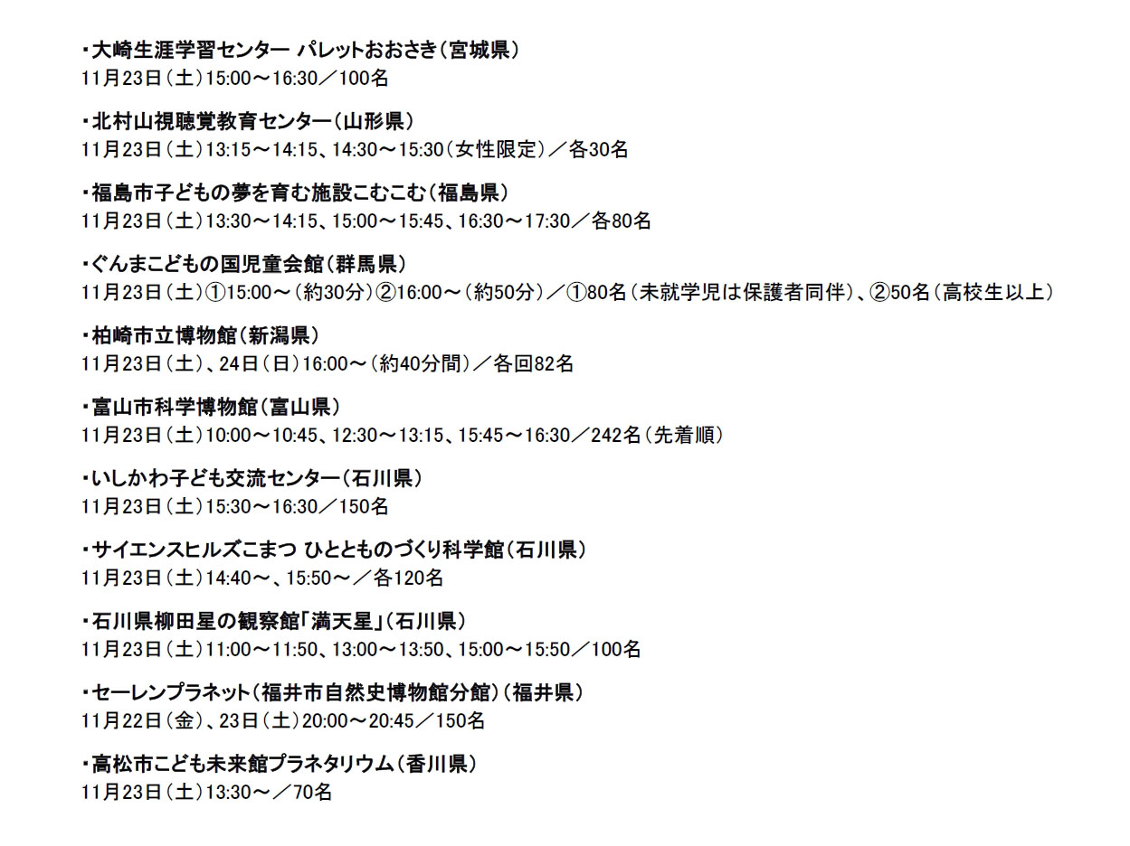星ナビ12月号イベント情報コーナー「パオナビ」(p70)にて、一部施設の「熟睡プラ寝たリウム」投影時刻・定員数を誤って掲載しておりました。お詫びして訂正いたします。正確な情報は以下をご覧ください。