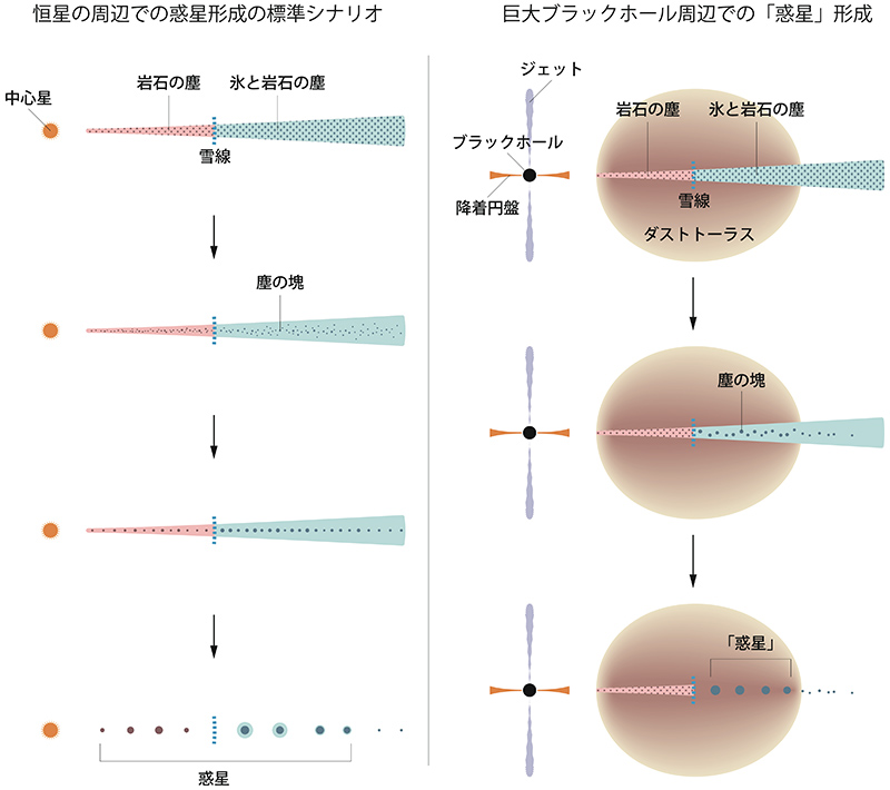 (左)太陽のような恒星の周りで起こる惑星形成の標準的なシナリオ。原始惑星系円盤は岩石や氷の塵とガスでできており、雪線(氷が昇華する温度の領域)より遠い側では氷で覆われた岩石の塵が、星に近い側では氷が融けて岩石のみでできた塵が分布している。それらの塵が集積することで惑星が形成される。(右)超大質量ブラックホールを取り巻く円盤で起こると考えられる「惑星」の形成シナリオ。ブラックホールのごく近傍には降着円盤(高速で回転する高温のガス円盤)が、離れた領域にはドーナツ状に塵が分布し回転する「ダストトーラス」と呼ばれる構造が、それぞれ広がっている。ダストトーラスの赤道面は密度が大きく円盤状となり、円盤の低温な領域に氷で覆われた岩石の塵が分布している。その氷と岩石の塵から「惑星」が形成される。画像クリックで表示拡大(提供:国立天文台、鹿児島大学)