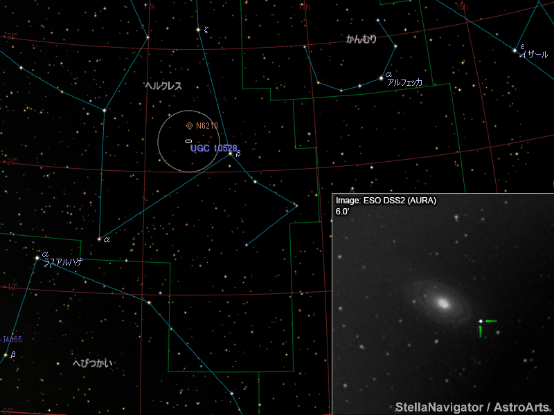 UGC 10528周辺の星図と、DSS画像に表示した超新星。画像クリックで星図拡大(「ステラナビゲータ」で星図作成。DSS画像の版権について)