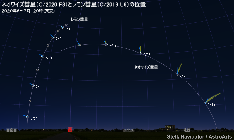 6月下旬~7月下旬のレモン彗星とネオワイズの位置(場所の設定は東京)。20時の方位と高さを表している。彗星は模式的に表現している。星図はステラナビゲータで作成。画像クリックで表示拡大