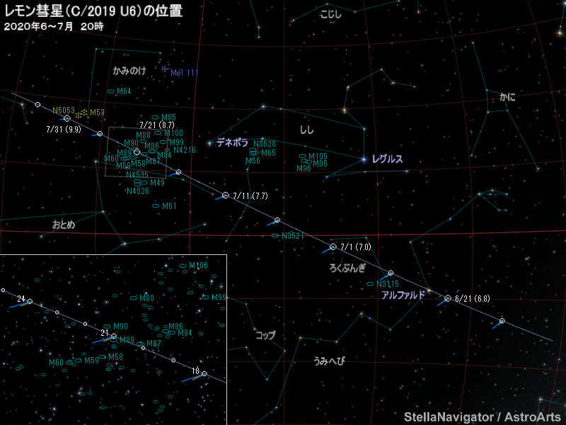 6月から7月ごろ、レモン彗星(C/2019 U6)が比較的明るくなると予想されている。ろくぶんぎ座からしし座、おとめ座へと移動し、夕方から宵の西の空に見える。
