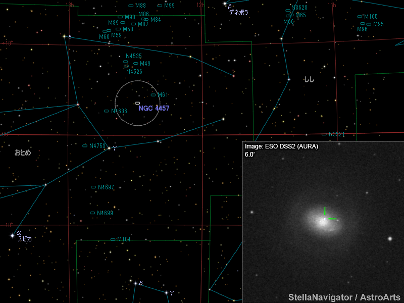 NGC 4457周辺の星図と、DSS画像に表示した超新星。画像クリックで星図拡大(「ステラナビゲータ」で星図作成。DSS画像の版権について)