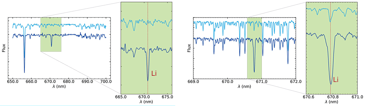 LAMOST(左)、すばる望遠鏡(右)によるリチウムのスペクトル線のデータ。それぞれの図でリチウム過剰な恒星(下側の濃い青線) と普通の恒星(上側の水色線)とを比較しており、リチウム過剰星では明瞭にスペクトル線が検出されている。LAMOSTでは多数の恒星を効率よく観測することができる一方、すばる望遠鏡では波長を細かく分けて測定できるため、より正確にリチウムの量を測定し、LAMOSTの結果を検証できる。画像クリックで拡大表示(提供:H. L. Yan (NOAC))