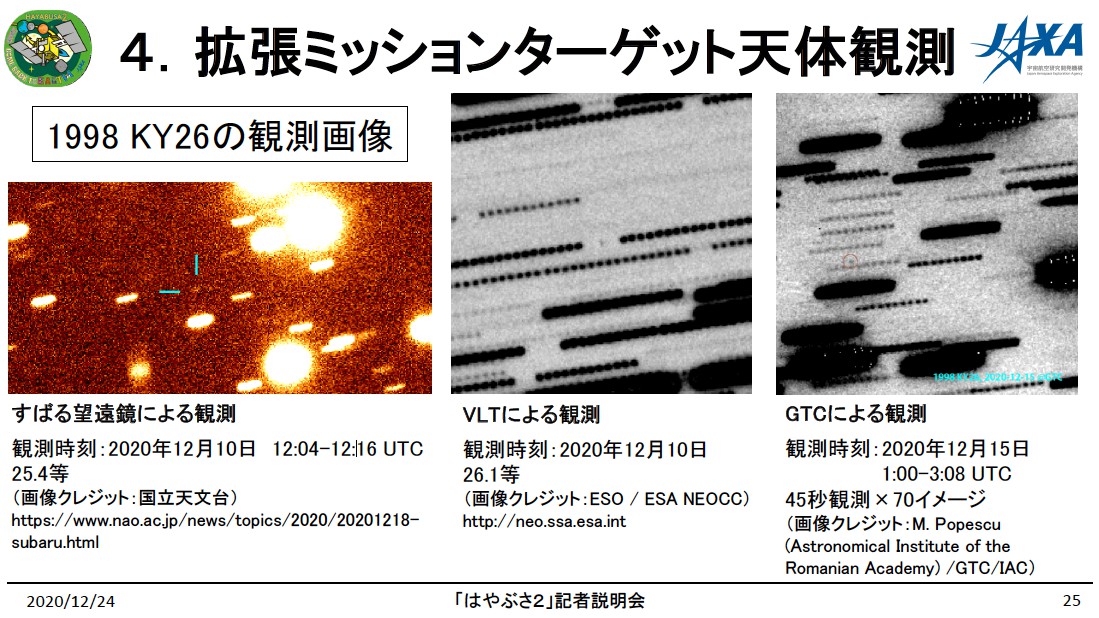 再び地球から遠ざかりつつある「はやぶさ2」が今後の「拡張ミッション」で目指す小惑星「1998 KY26」の地上観測画像も公開された。1998 KY26はちょうど衝の時期を迎えており、12月10~15日の間に米・ハワイのすばる望遠鏡やチリのVLT、スペイン領カナリア諸島のGTCなどの大望遠鏡で観測が行われ、25~26等級の姿がとらえられた(参照:「すばる望遠鏡、「はやぶさ2」の次の目標天体を撮影」)。これらの観測により、観測データが少ないこの天体の軌道をより高精度のものに改良することができ、拡張ミッションの軌道計画に役立てられるという。