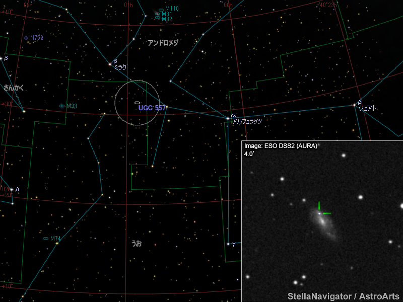 UGC 557周辺の星図と、DSS画像に表示した超新星。画像クリックで星図拡大(「ステラナビゲータ」で星図作成。DSS画像の版権について)