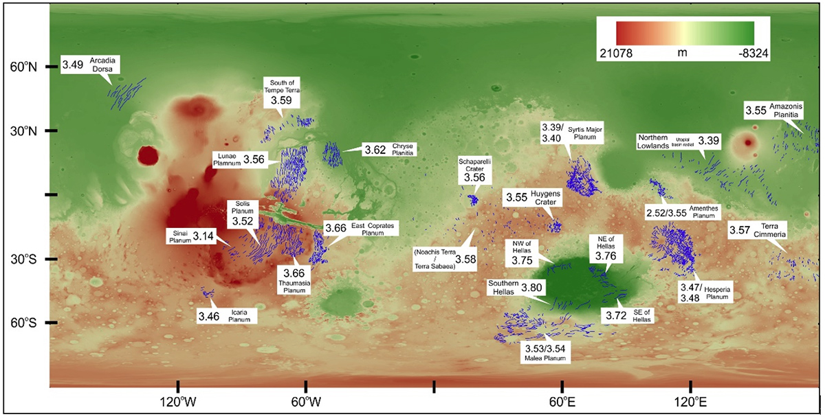 火星全球でのリンクルリッジの分布と形成年代を示したマップ。(青線)特定したリンクルリッジ。(数字)BCCに基づき決定された年代(単位:Ga、1Ga=10億年)。背景色は1枚目と同じ数値標高モデルに基づく火星全球の標高を示す。画像クリックで拡大表示