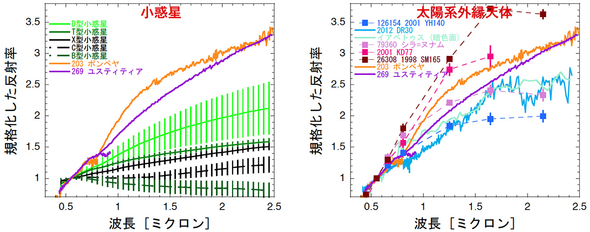 太陽系外縁部にしか存在しないと思われていたこのような赤い天体が、小惑星帯で見つかった。小惑星帯で直径100km以上の小惑星の分光サーベイを実施ししているJAXA宇宙科学研究所の長谷川直さんたちの研究チームは、直径110kmの「ポンペヤ((203) Pompeja)」のスペクトルがどの小惑星グループよりも赤く、太陽系外縁天体と似た傾向であることを突き止めた。さらに過去の研究を調べたところ、直径55kmの「ユスティティア((269) Justitia)」もポンペヤと同様な赤さであることがわかった。